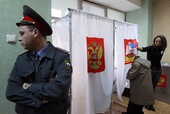 A police officer stands next to voting cabins during local elections in the Moscow suburb of Khimki October 14, 2012. Russia held local elections from the Baltic Sea to the Chinese border on Sunday, testing President Vladimir Putin’s grip nationwide and the reach of his opponents five months into his new term. REUTERS/Sergei Karpukhin (RUSSIA – Tags: POLITICS ELECTIONS)