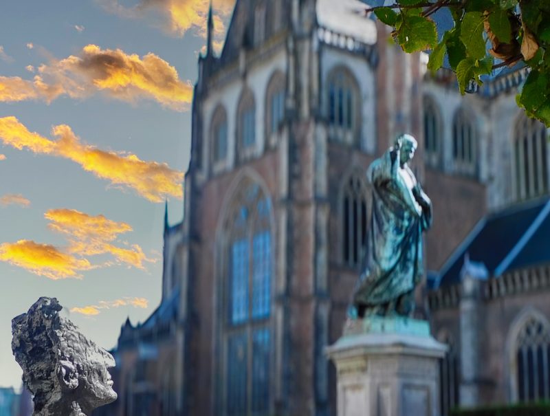 Standbeeld van Harry Mulisch, ereburger van zijn geboorteplaats Haarlem, samen met Laurens Janszoon Coster, vernieuwer van de boekdrukkunst, op de achtergrond de Sint Bavo-kerk.