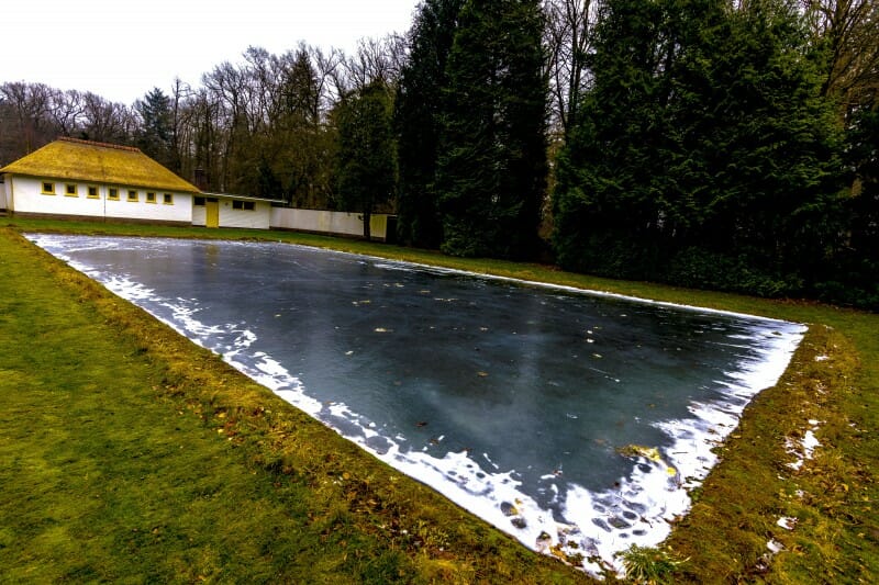 Zwembad met op de achtergrond de sauna van de Oranjes. Ieder jaar op 1 januari nam prins Bernhardt hier een duik.